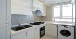 کابینت سفید زیبا است ولی احتیاج به زحمت و نظافت دارد که گفتیم اگر با رنگ چوبی یا کابینت طرح چوب ترکیب شود از خستگی شما کم کرده و جذاب تر میشود.