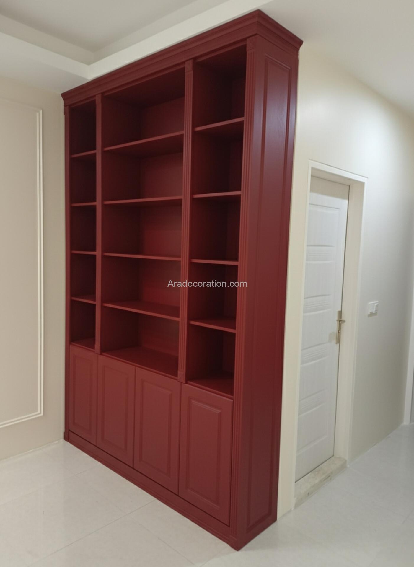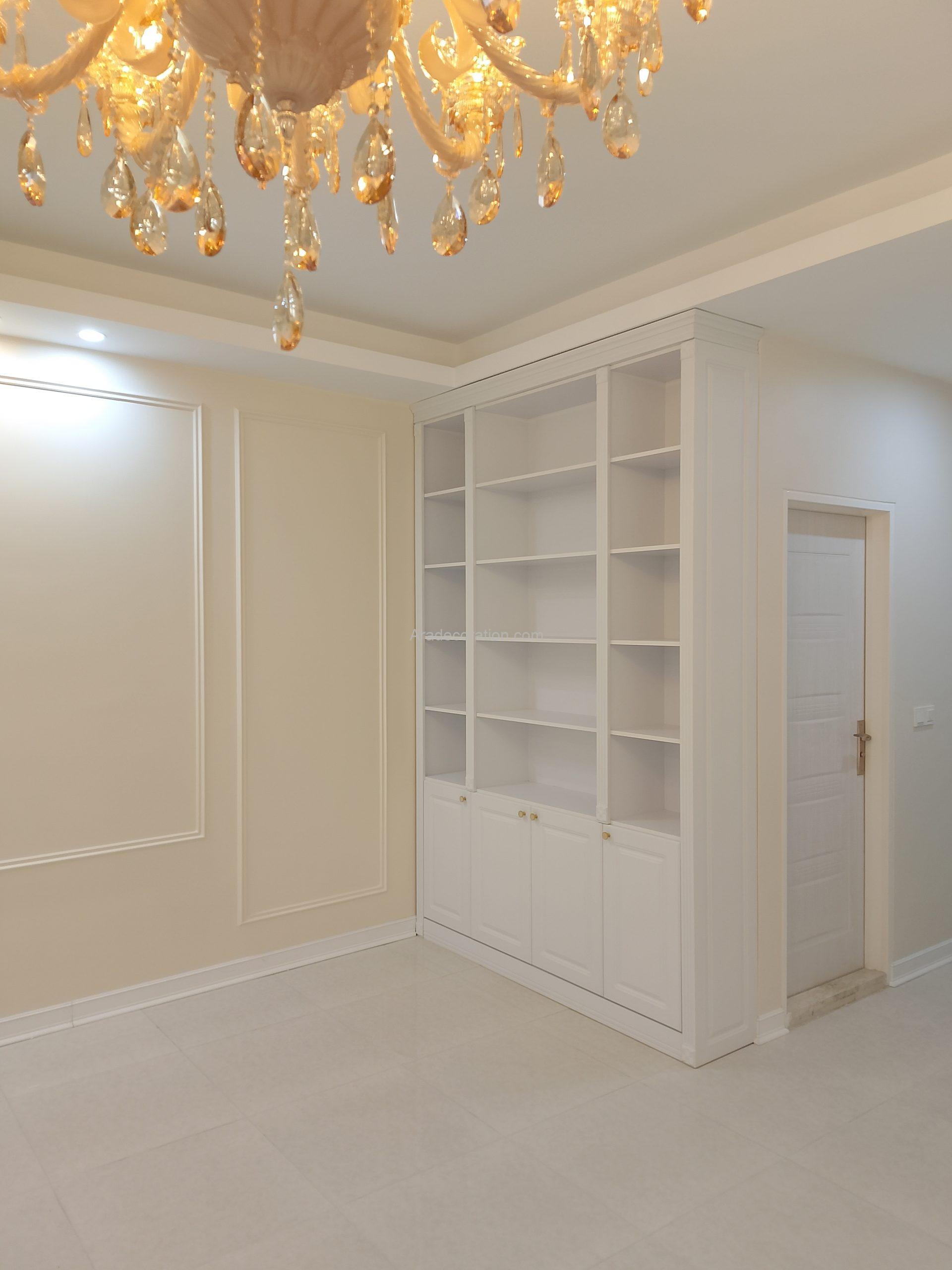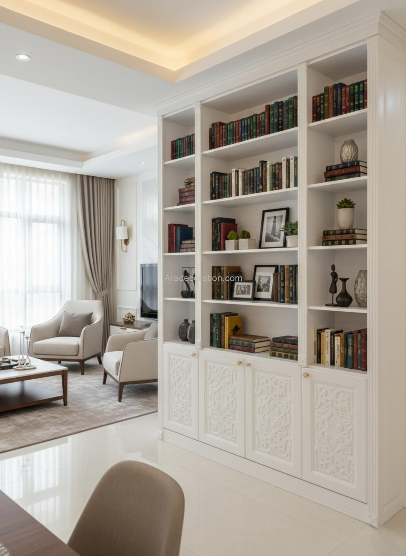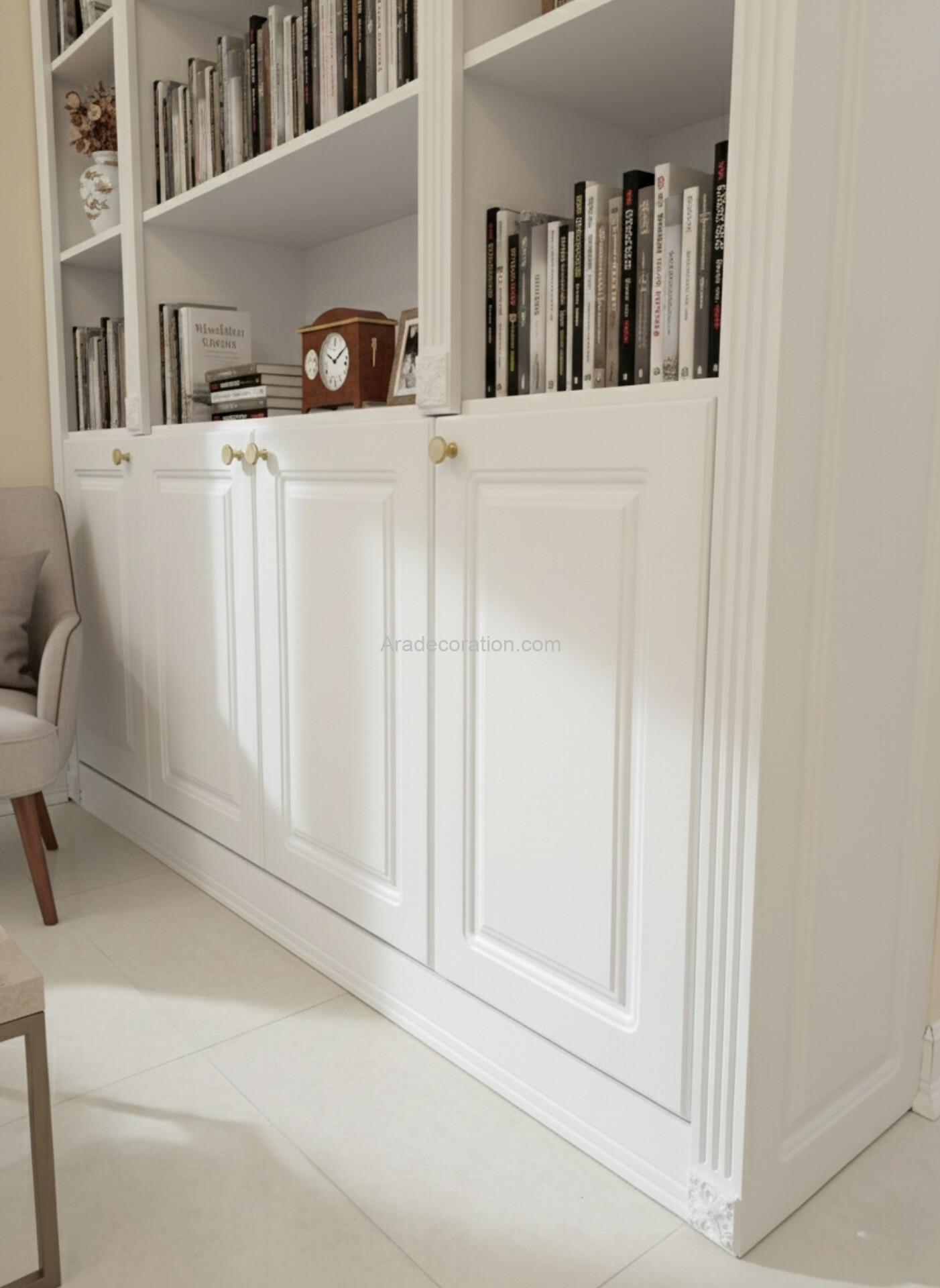 قالب تاج شیک در بالای کتابخانه، شکوه و اصالت نئوکلاسیک را به فضای شما هدیه میدهد.