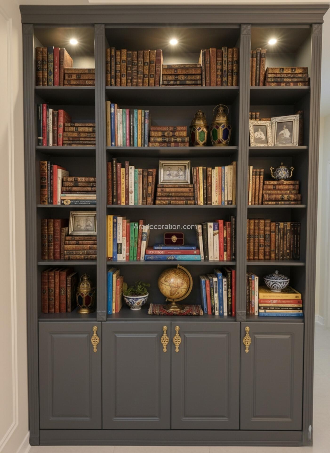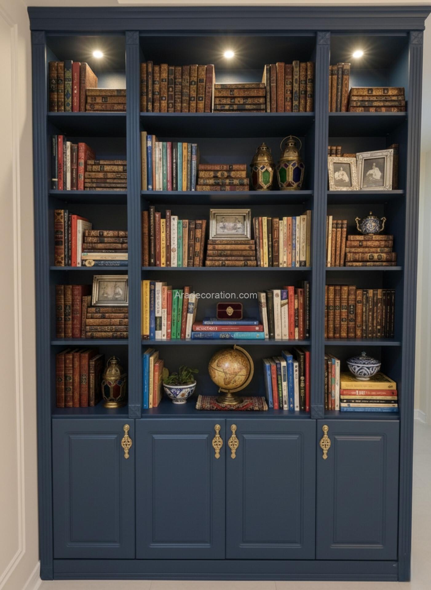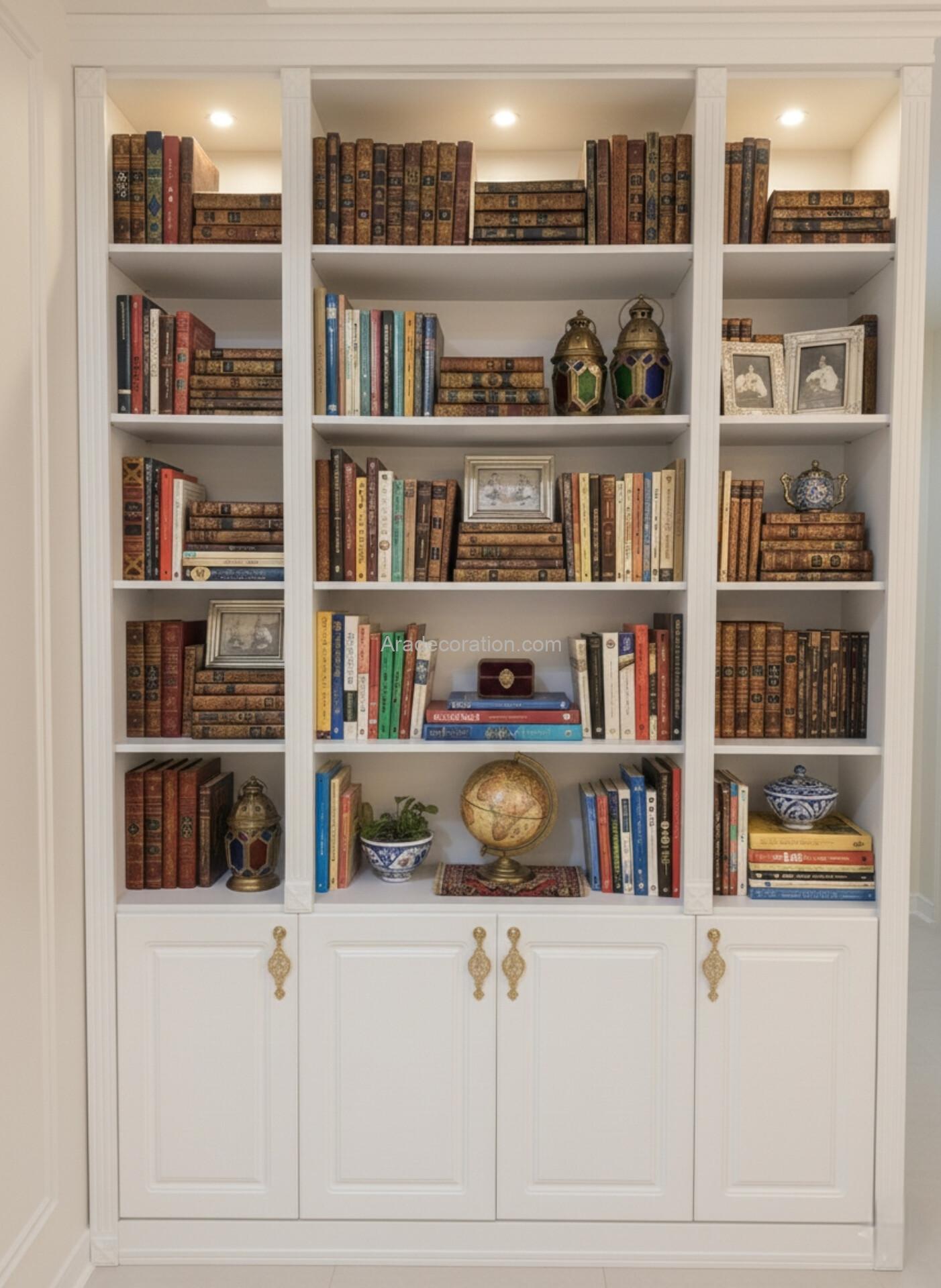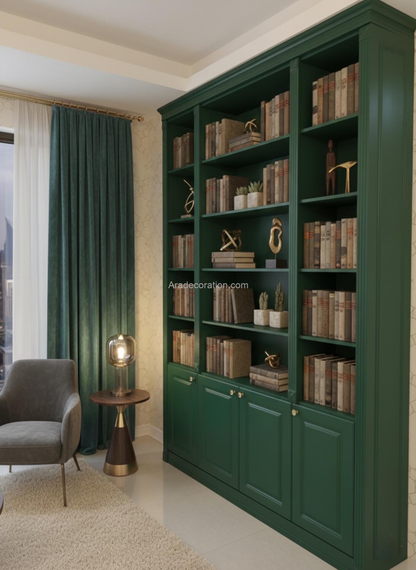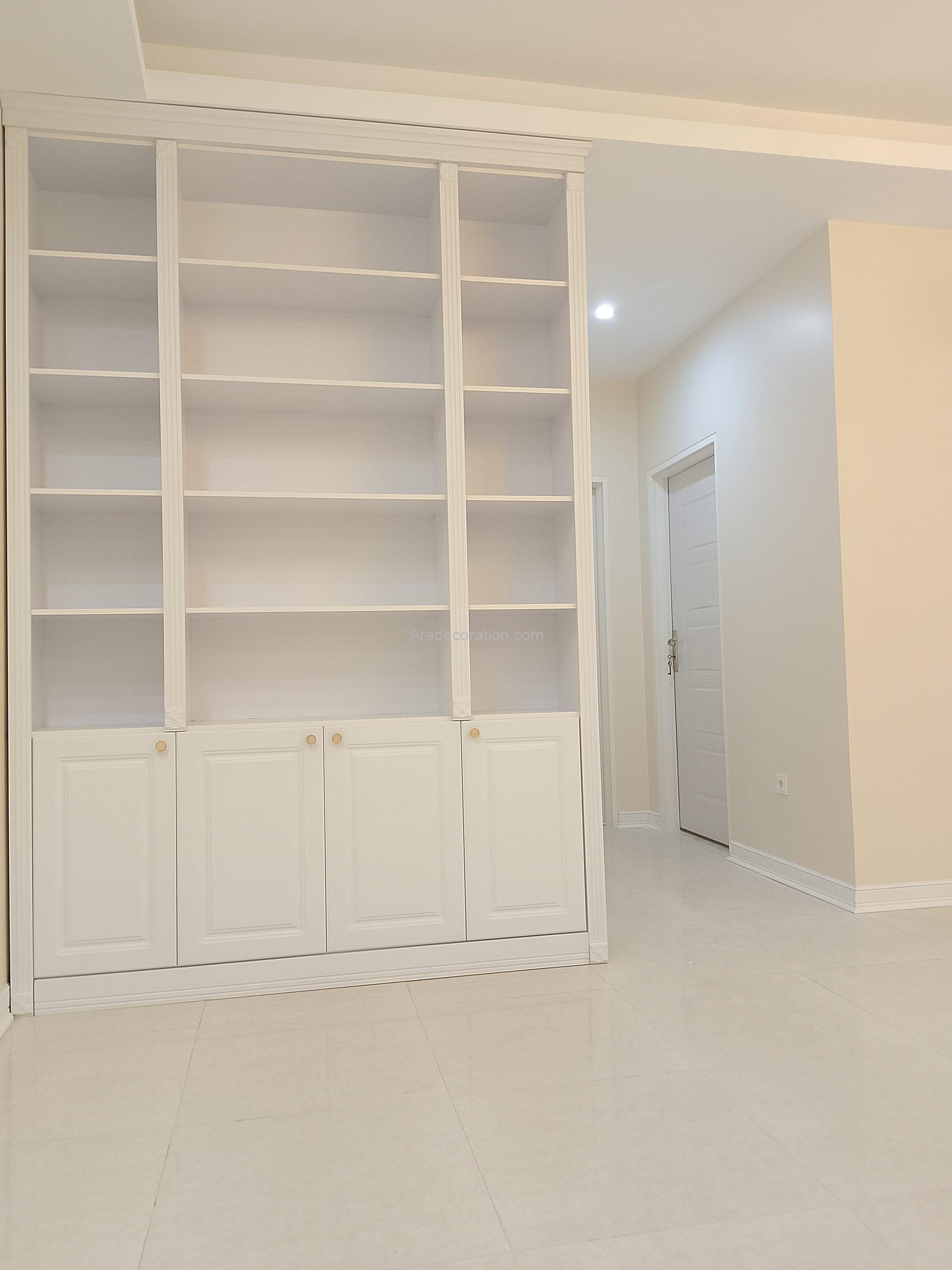 قالب تاج شیک در بالای کتابخانه، شکوه و اصالت نئوکلاسیک را به فضای شما هدیه میدهد.